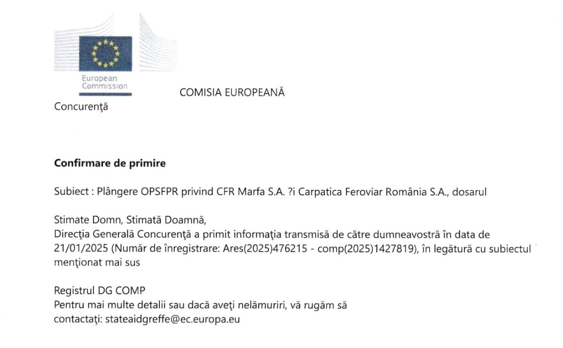 - Confirmarea privind înregistrarea plângerii la grefa Comisiei Europene, DG Competition - 3 februarie 2025